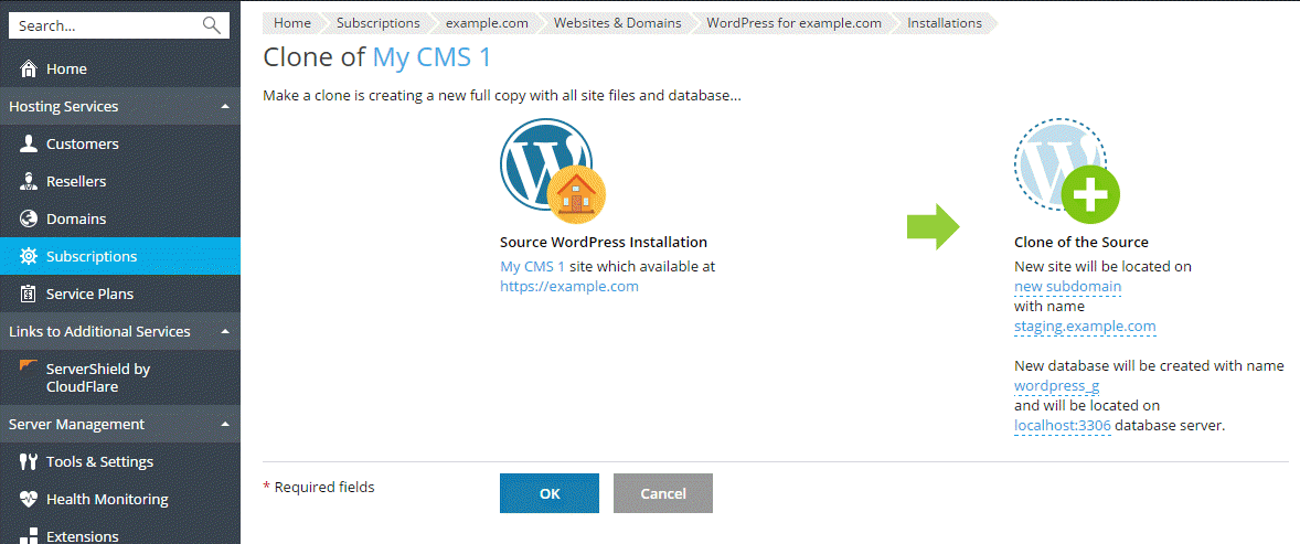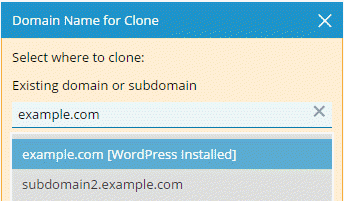 Hinweis: Vergewissern Sie sich, dass die als Ziel ausgewählte Domain oder Subdomain nicht von einer bereits vorhandenen Website verwendet wird. Beim Klonen werden möglicherweise vorhandene Website-Daten am Ziel überschrieben und gehen somit verloren.